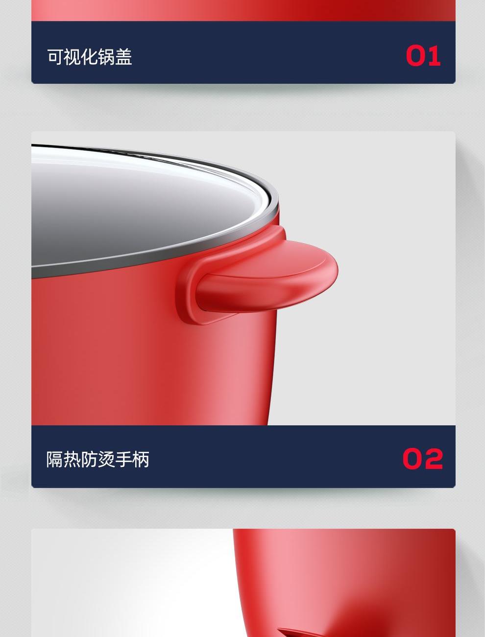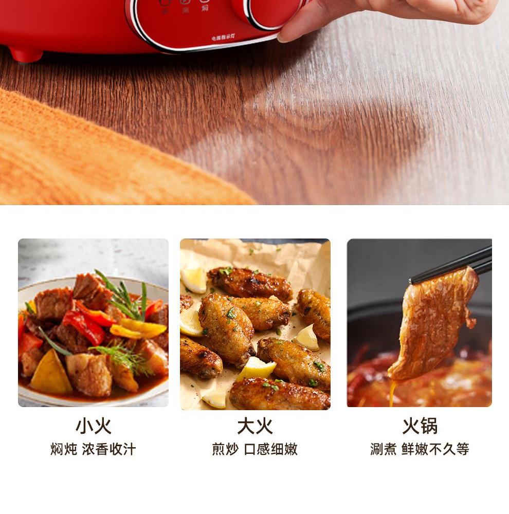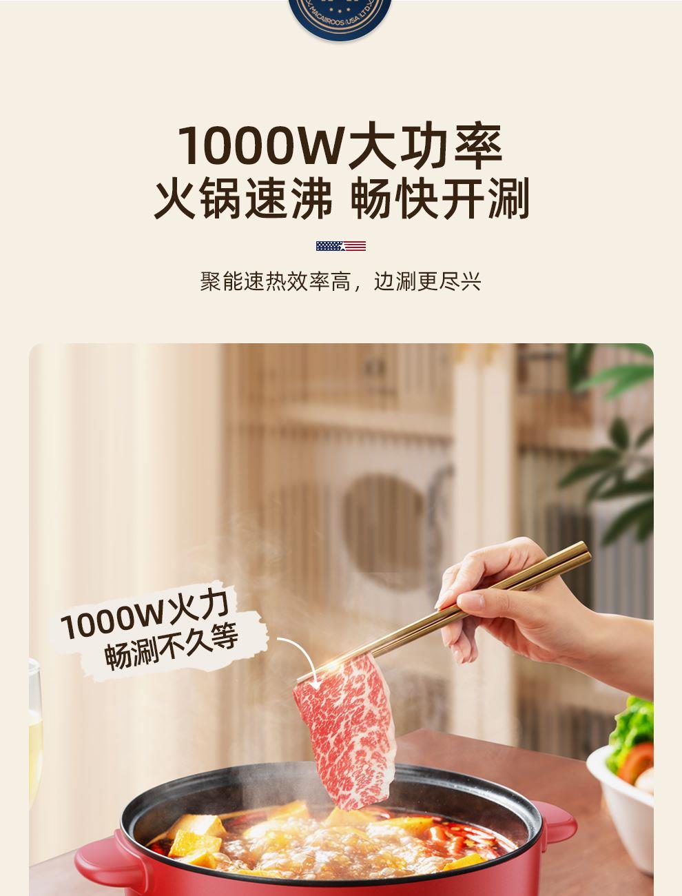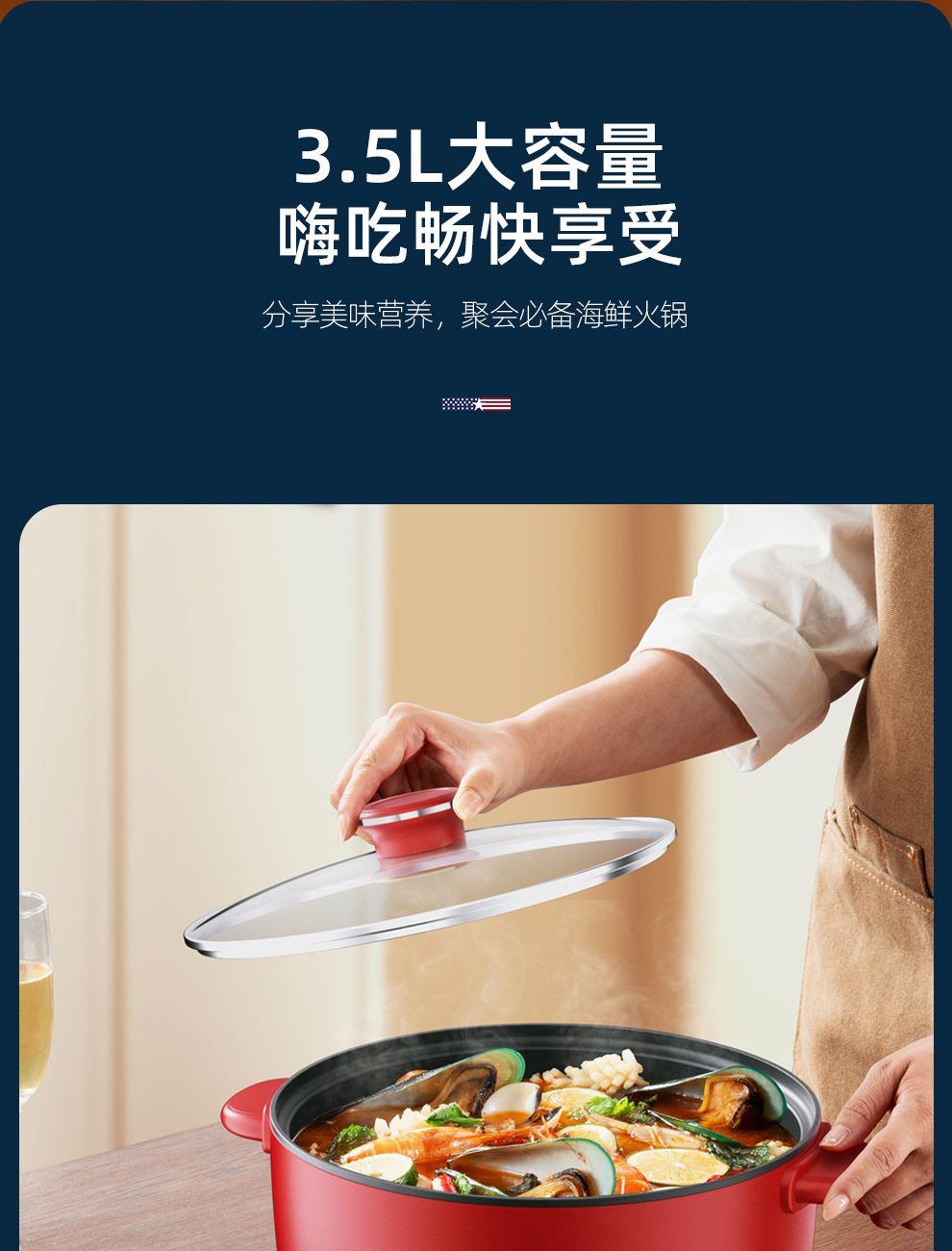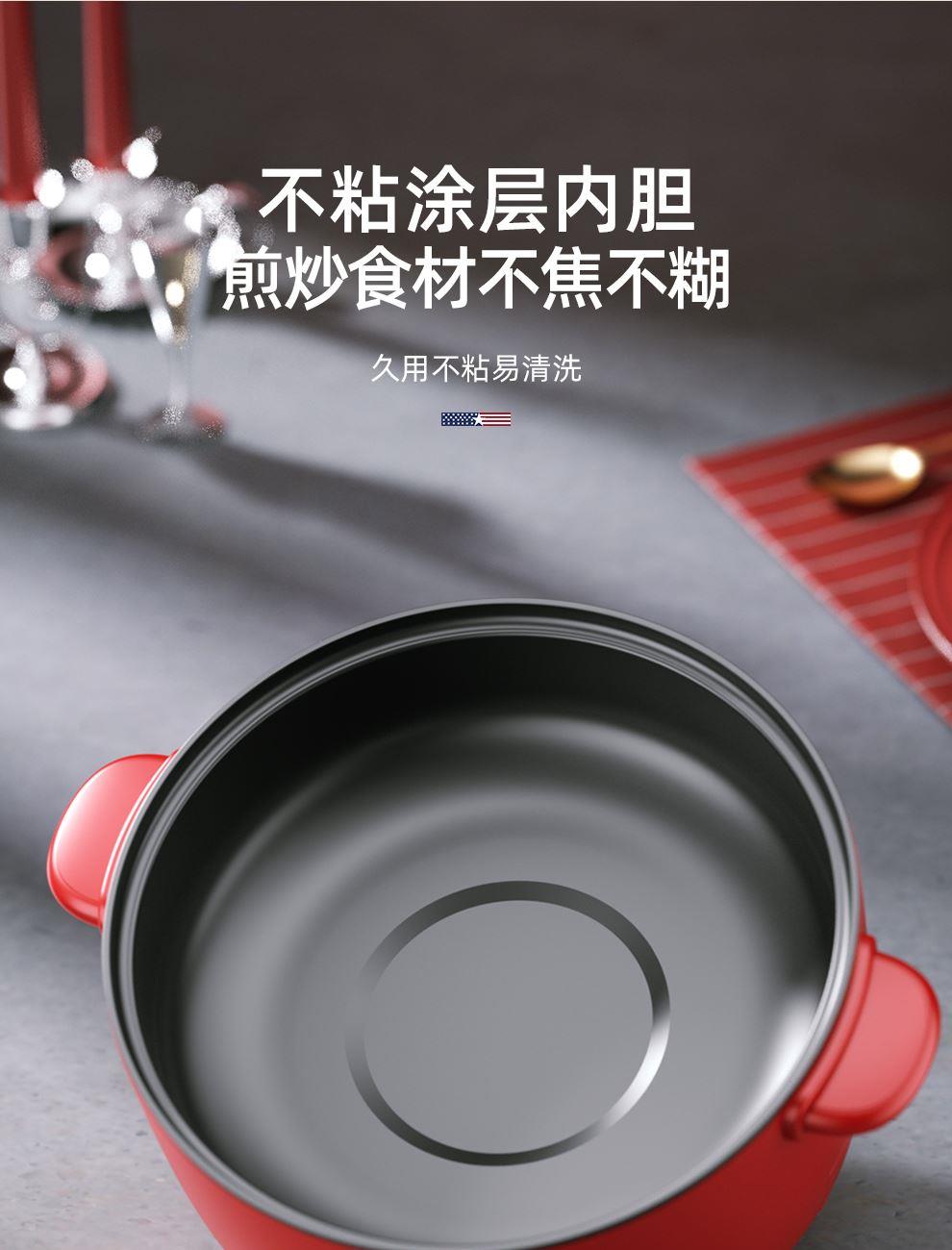 額定功率:1000W 額定容量:3.5L 額定電壓:220V~ 額定頻率:50Hz 產品凈重:1.2kg 產品毛重:1.65kg 整箱重量:14.7kg 一鍋多用&三檔火力調節燜/燉/涮/煮/煎一鍋多用,三檔火力調節,滿足不同烹飪需求; 3.5L恰好容量滿足私享/小聚,1000W大功率且受熱均勻,美味不久等; 不粘內膽材質安全,可煎/可煮烹飪不粘鍋,易清洗。 雙層防燙&防燙提手雙層防燙材質,雙邊防燙提手方便移動清洗。