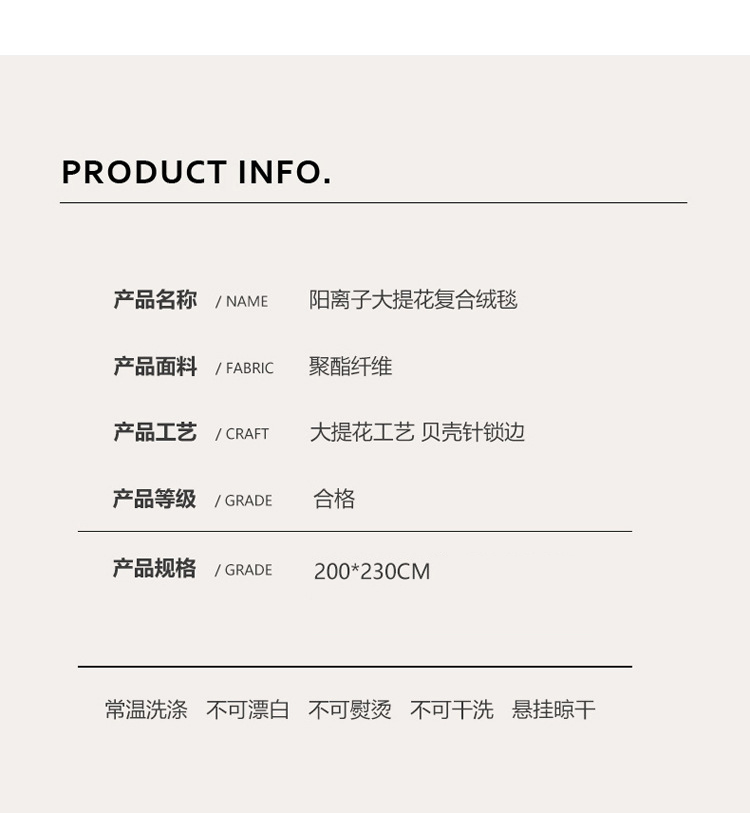 尺寸:200*230cm 面料:聚酯纖維 執(zhí)行標準:GB/T22796-2021 安全類別:GB18401-2010 B類 1.柔軟親膚,絨毛舒適。蓄熱保暖如春天般的溫暖。面料經(jīng)過無靜電處理,健康舒適環(huán)保。同時采用綠色環(huán)保印染工藝,持久鮮艷 2.簡約設(shè)計,使得毯子更顯檔次,更顯時尚。精致的包邊工藝,做工精細,針腳細密,不易脫線,牢固耐用。