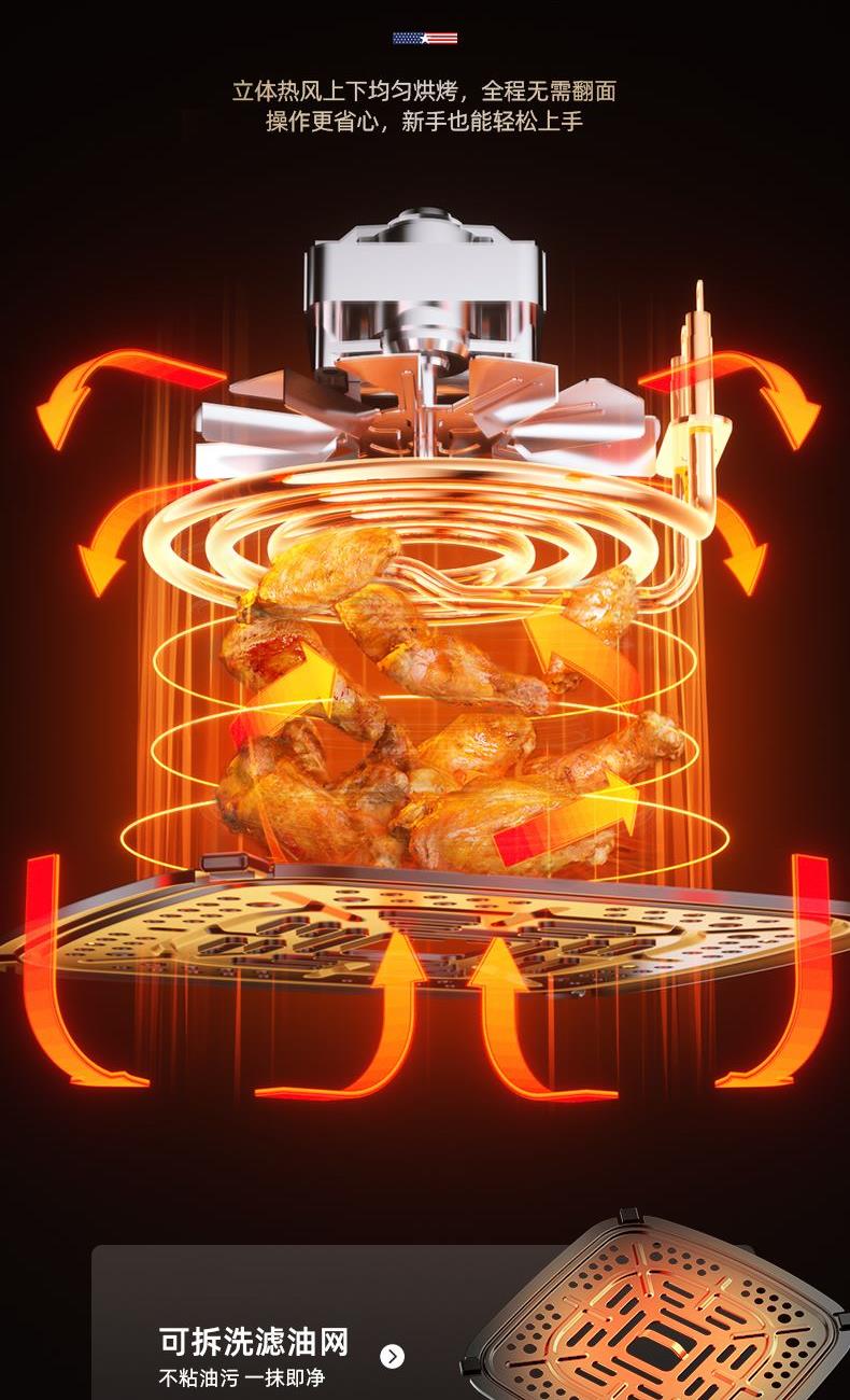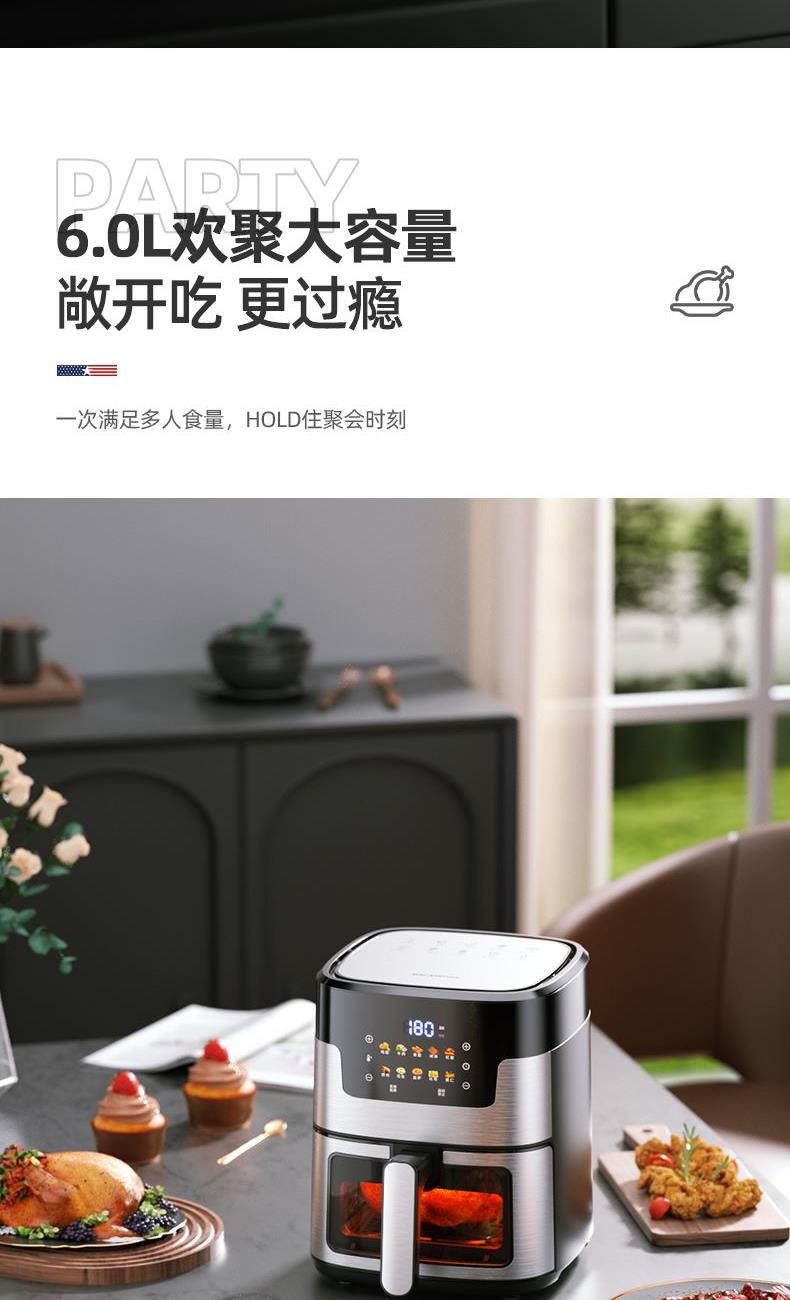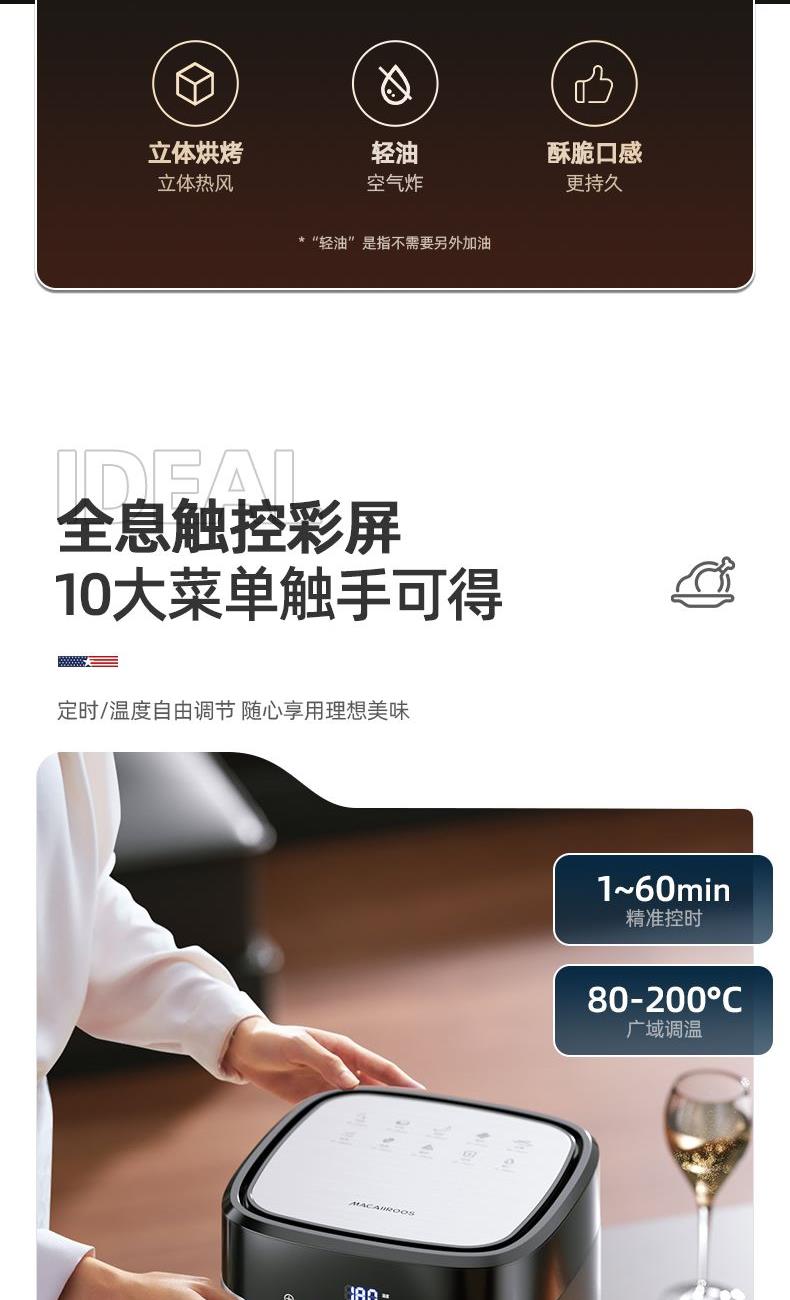 額定功率:1350W 額定容量:6.0L 額定電壓:220V~ 額定頻率:50Hz 產品凈重:3.4kg 產品毛重:3.8kg 6L大容量&可視化窗口大容量一次出爐,炸全雞無壓力;無需抽拉,食材狀態可見; 360度熱風循環&微蒸嫩烤快速高溫,穿透食物返出油脂,加適量水可實現外酥里嫩口感; 觸控大彩屏10大菜單,預設智能程序,匹配溫度與時間; 多重保護提籃斷電,使用安全放心。