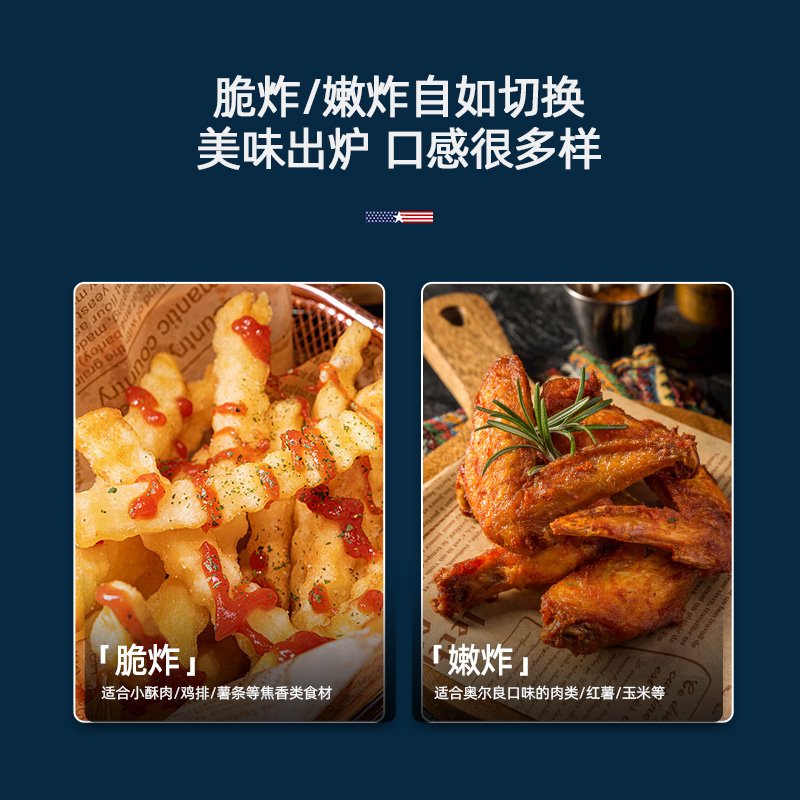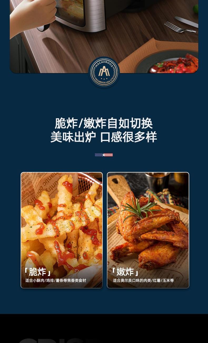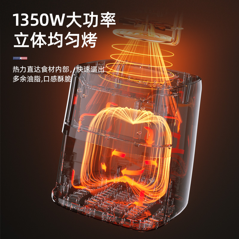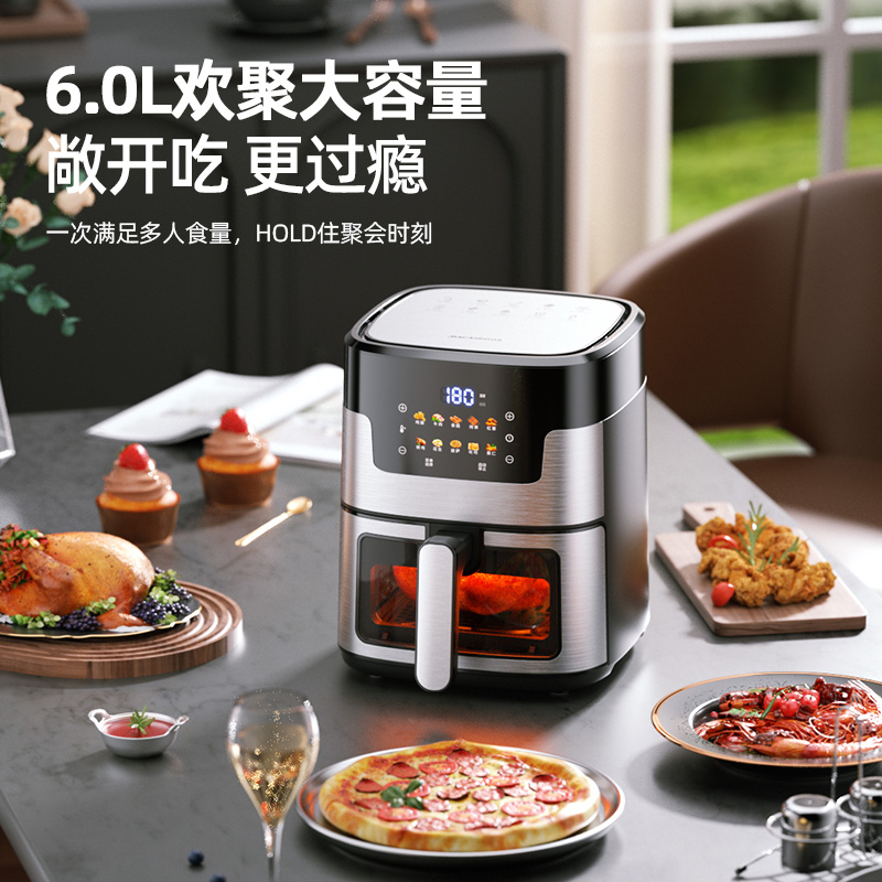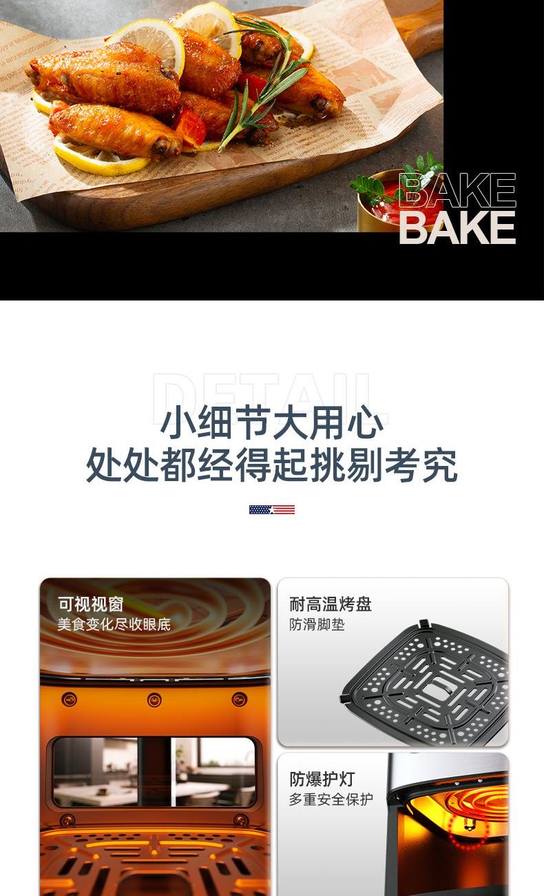 額定功率:1350W 額定容量:6.0L 額定電壓:220V~ 額定頻率:50Hz 產品凈重:3.4kg 產品毛重:3.8kg 6L大容量&可視化窗口大容量一次出爐,炸全雞無壓力;無需抽拉,食材狀態可見; 360度熱風循環&微蒸嫩烤快速高溫,穿透食物返出油脂,加適量水可實現外酥里嫩口感; 觸控大彩屏10大菜單,預設智能程序,匹配溫度與時間; 多重保護提籃斷電,使用安全放心。