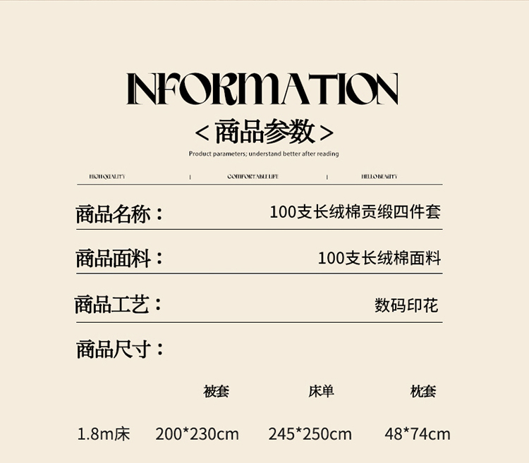 被套:200*230cm 床單:245*250cm 枕套:74*48cm*2 面料:100支長絨棉 執行標準:GB/T22796-2021 安全類別:GB18401-2010 B類 1.100支新疆棉面料,細膩垂墜感好,如絲如緞珠般光澤,觸感柔軟爽滑,色彩柔和飽滿,經久耐用不易褪色;2.采用精美刺繡工藝,高顏值點綴家居生活,匠心鑄造。