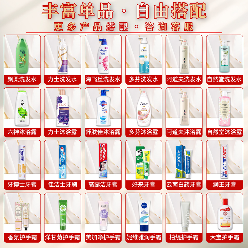 禮盒尺寸:32*8.5*24.5cm 包裝尺寸:66* 46.5*51 CM 產品配置:(香型隨機) 夏士蓮洗發水400ml 力士洗發水350ml 力士香皂105g 潔麗雅毛巾(69*33cm) 高露潔牙膏90g 高露潔牙刷 香氛身體乳300ml 奧妙洗衣液400g 精美禮盒