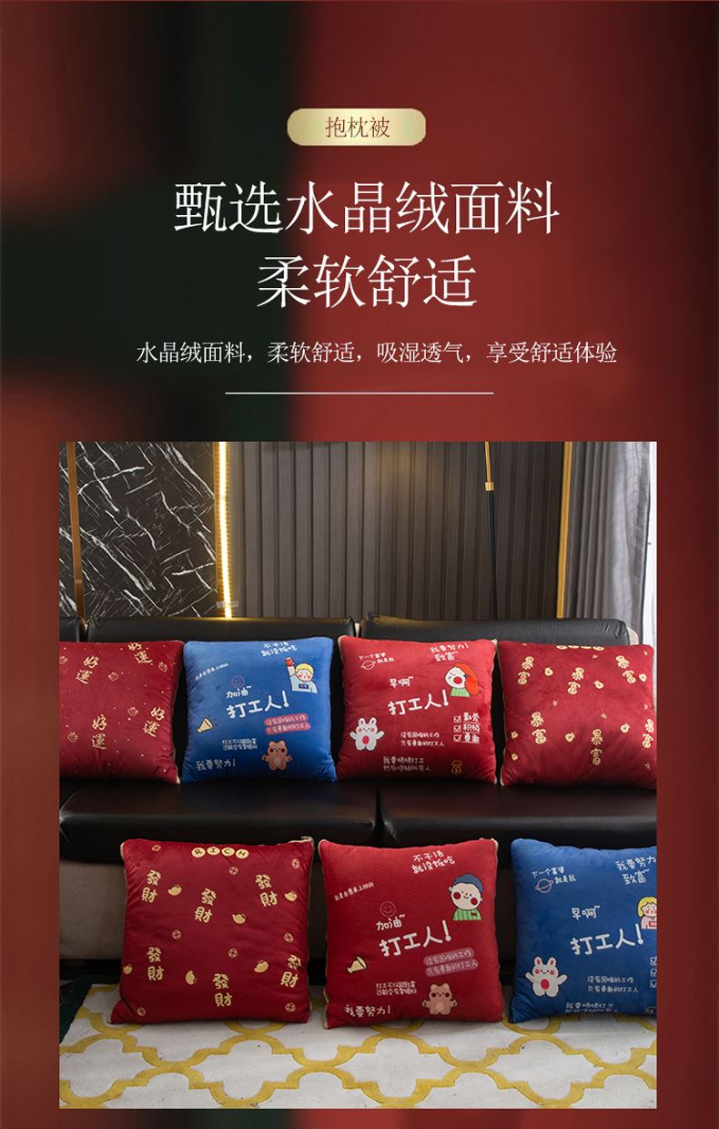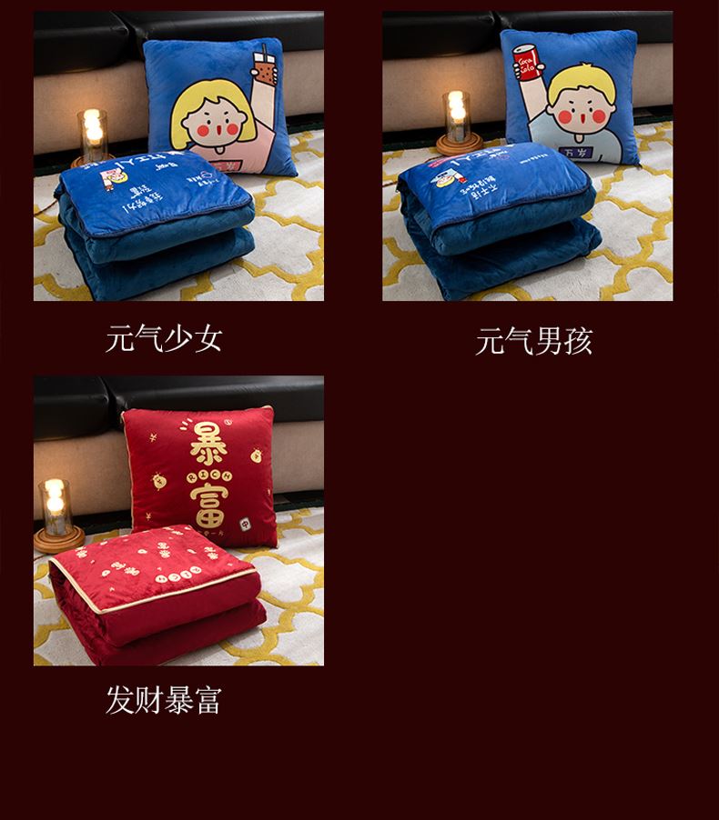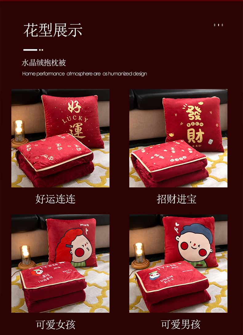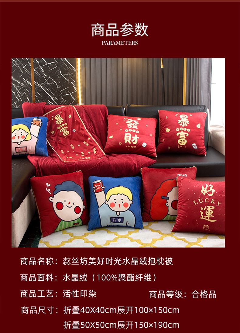 花色:好運連連/可愛男孩/可愛女孩/元氣男孩/元氣女孩/招財進寶 規格:折疊40*40cm展開100*150cm 面料:水晶絨(聚酯纖維) 填充:聚酯纖維 甄選水晶絨面料,柔軟舒適,吸濕透氣;合上是抱枕,打開是多功能蓋毯,一物多用,方便快捷,隨身攜帶;活性印染工藝,色牢度高,不易褪色,不懼機洗水洗;絎縫工藝,固定內芯,不易泡棉;金屬拉鏈設計,順滑易拉,不易卡殼。