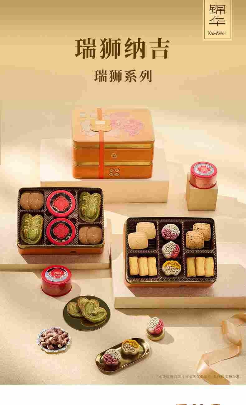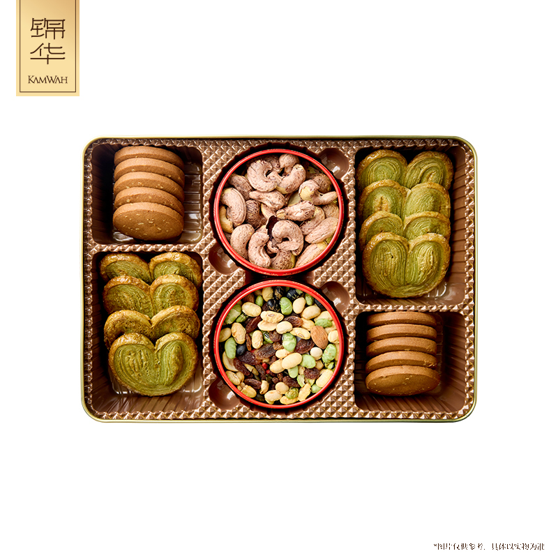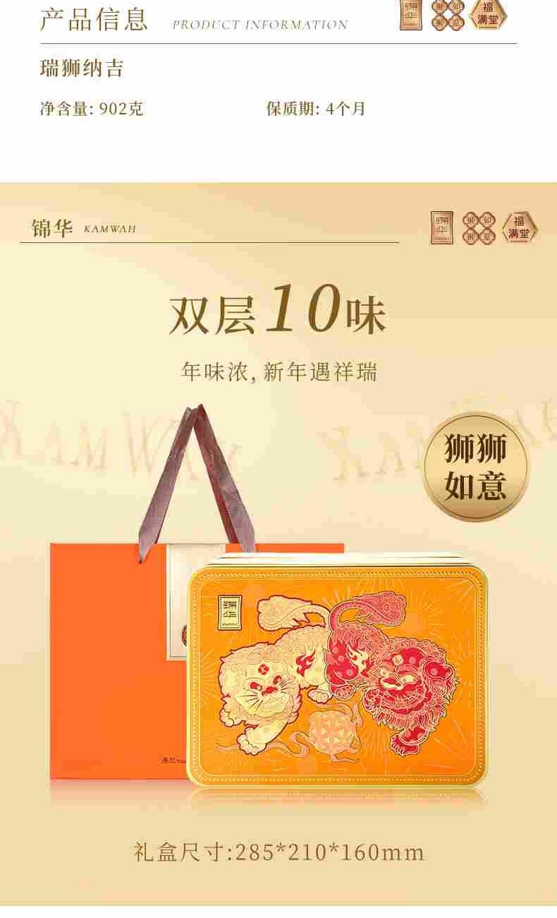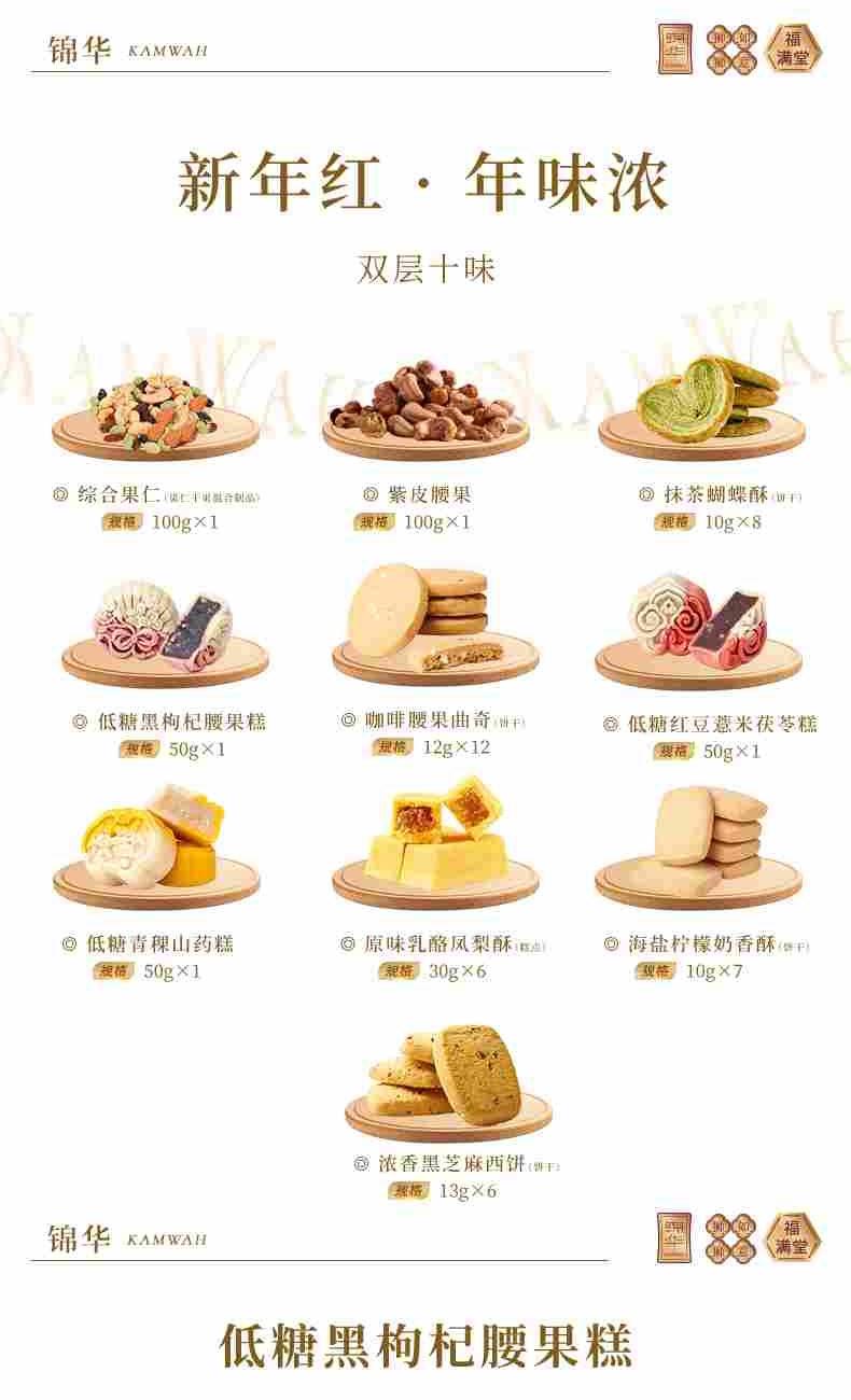 錦華瑞獅納吉 凈含量:902克 紫皮腰果100克*1 綜合果仁(果仁干果混合制品)100克*1 抹茶蝴蝶酥(餅干)10克*8 咖啡腰果曲奇(餅干)12克*12 低糖黑枸杞腰果糕50克*1 低糖紅豆薏米茯苓糕50克*1 低糖青稞山藥糕50克*1 原味乳酪鳳梨酥(糕點)30克*6 海鹽檸檬奶香酥(餅干)10克*7 濃香黑芝麻西餅(餅干)13克*6