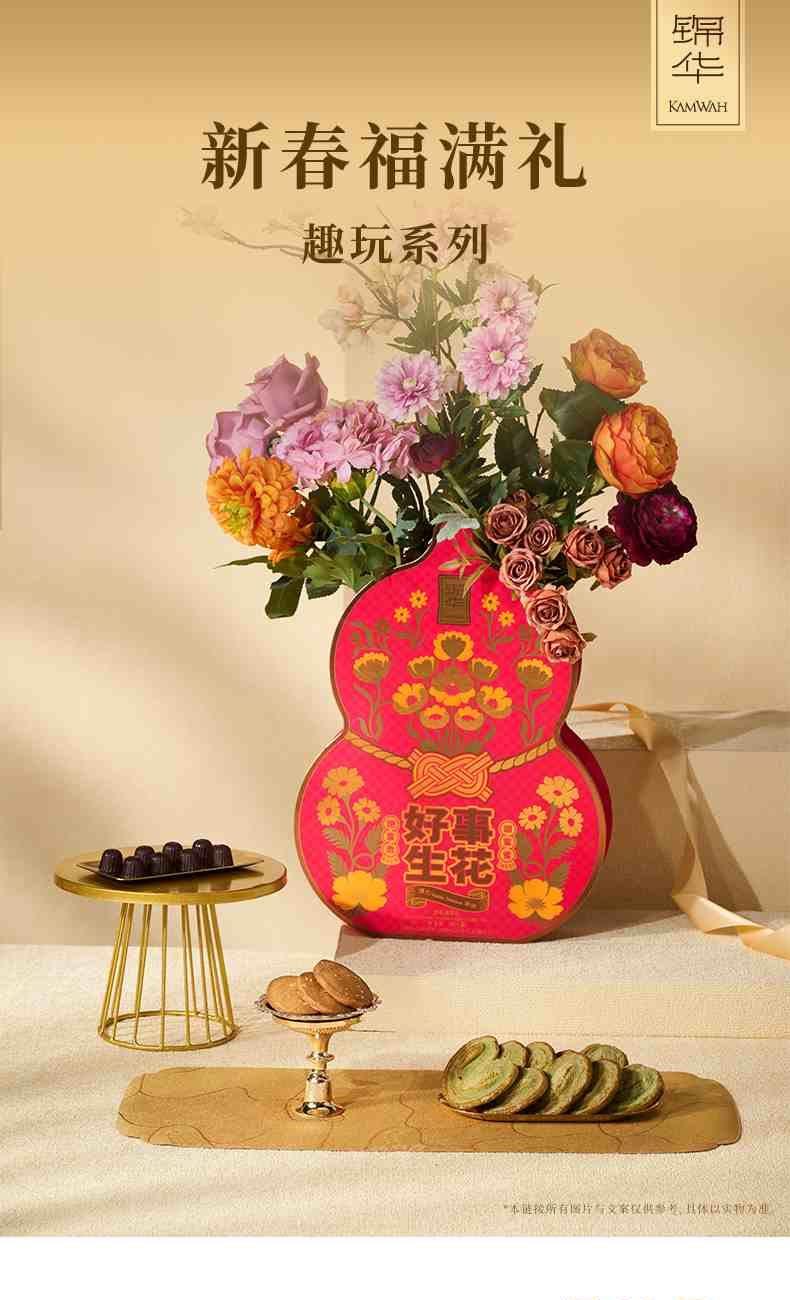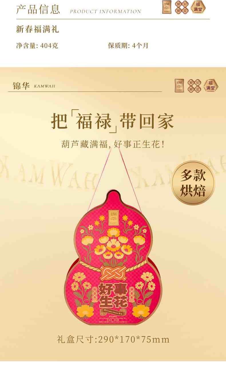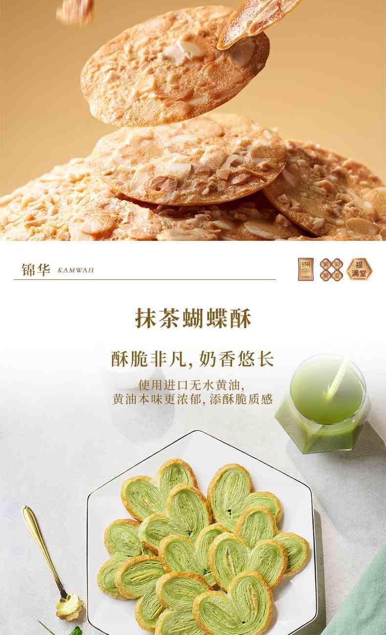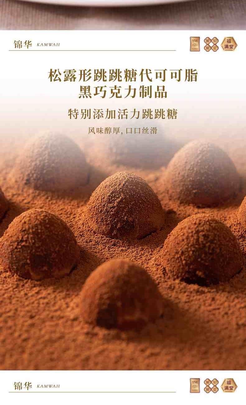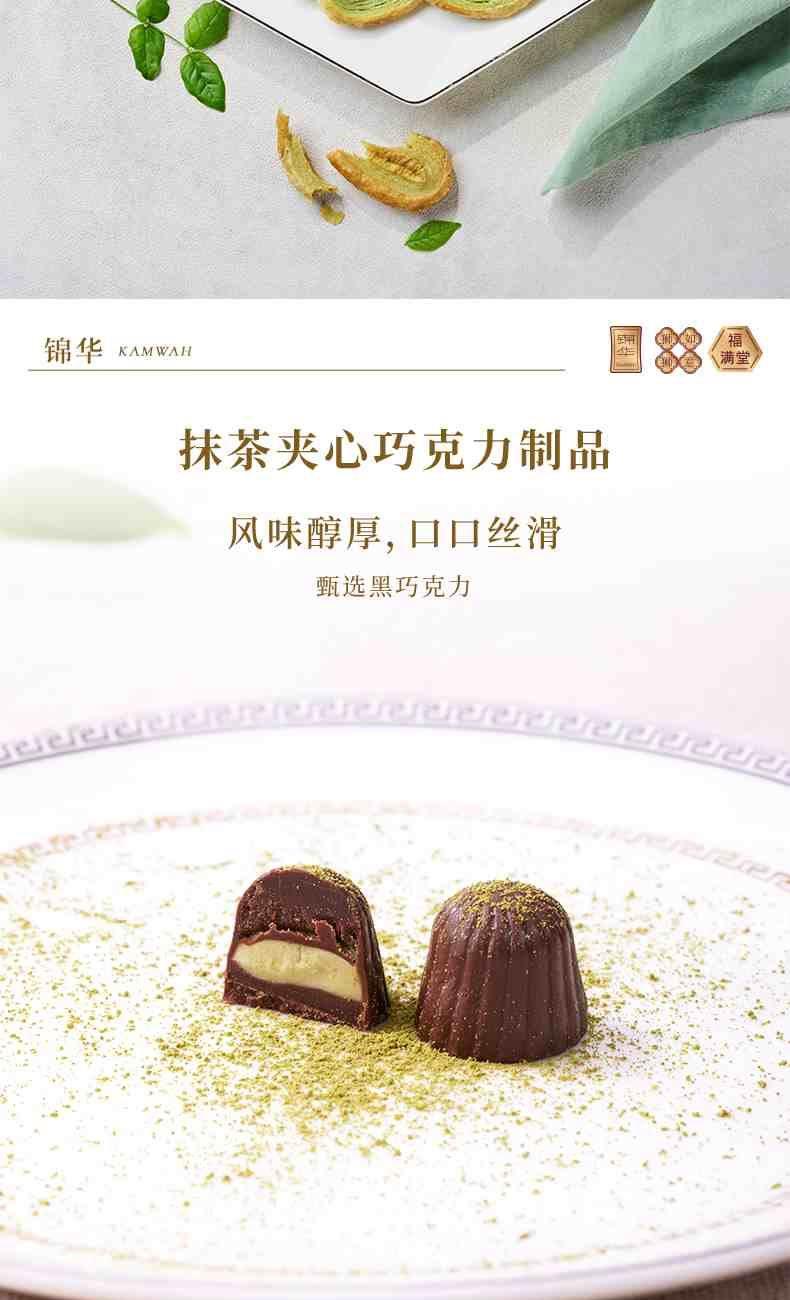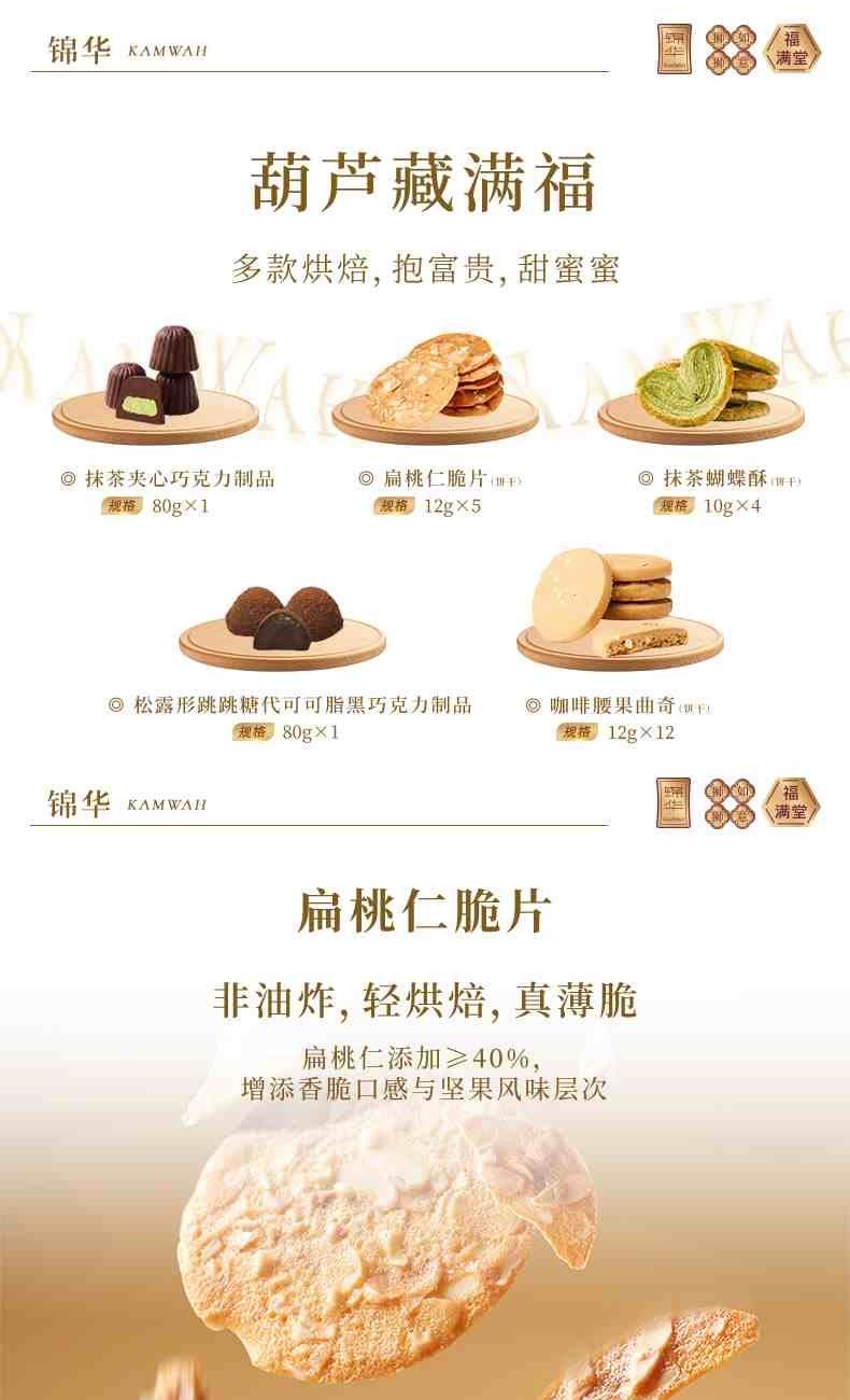 錦華新春福滿禮 凈含量:404克 抹茶夾心巧克力制品80克*1 松露形跳跳糖代可可脂黑巧克力制品80克*1 抹茶蝴蝶酥(餅干)10克*4 扁桃仁脆片(餅干)12克*5 咖啡腰果曲奇(餅干)12克*12