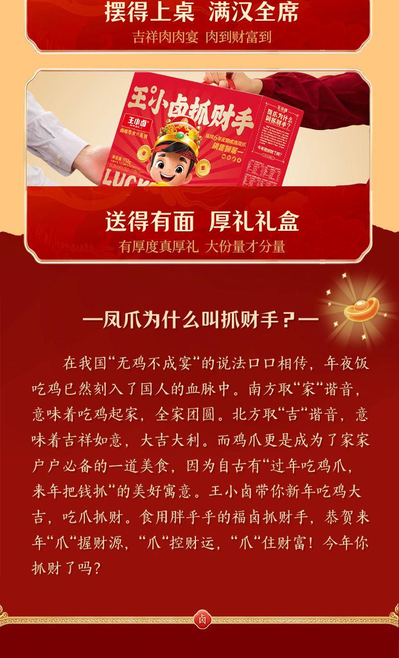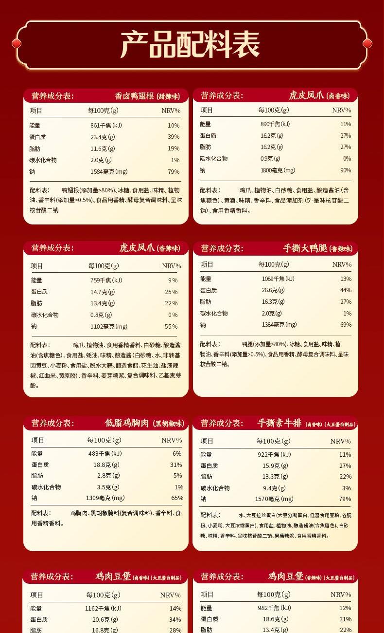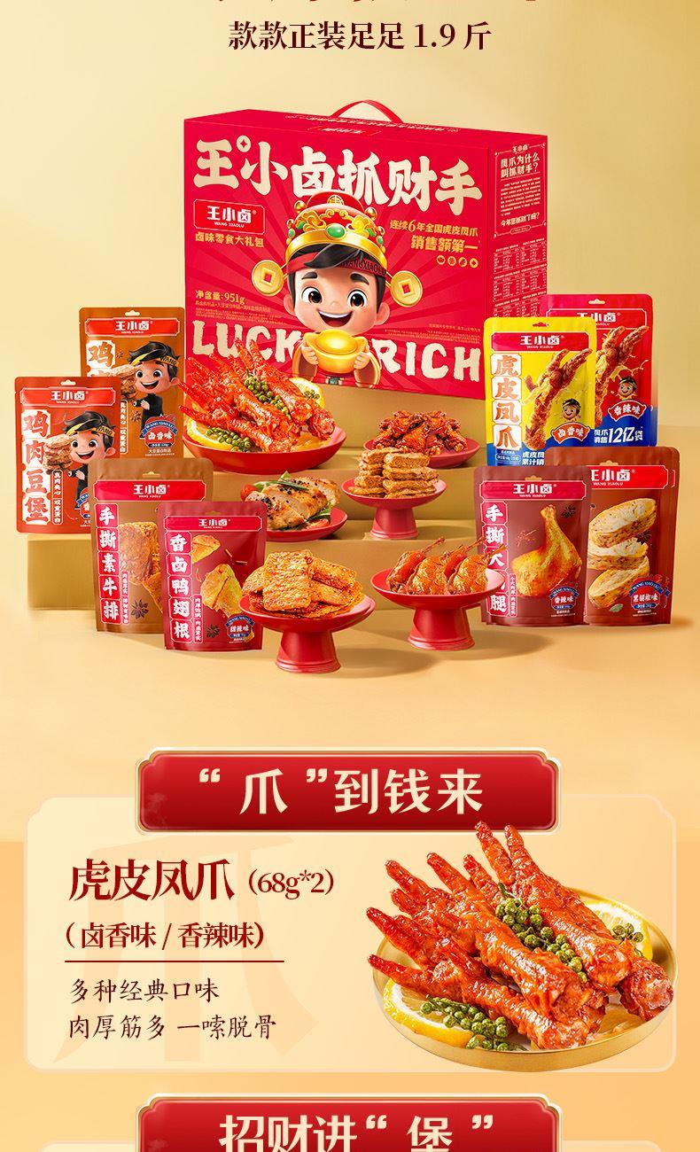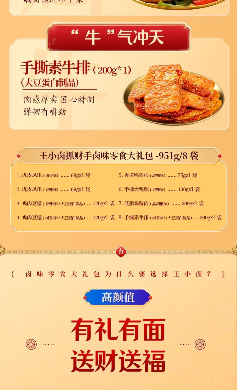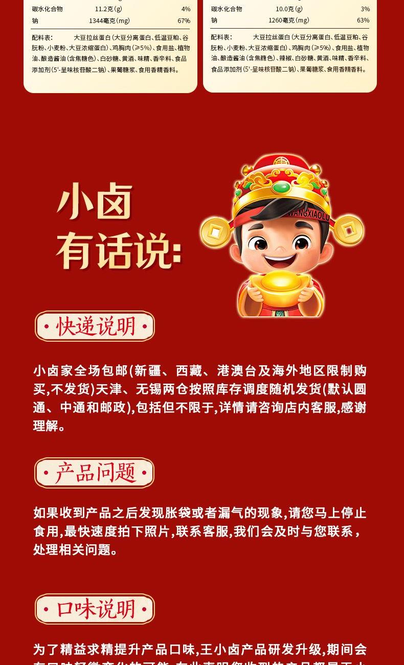 王小鹵虎皮鳳爪-鹵香-68g 王小鹵虎皮鳳爪-香辣-68g 王小鹵雞肉豆堡-鹵香-120g 王小鹵雞肉豆堡-香辣-120g 王小鹵鴨翅根-甜辣-75g 王小鹵手撕鴨腿-香辣-100g 王小鹵雞胸肉-黑胡椒-200g 王小鹵素牛排-鹵香-200g
