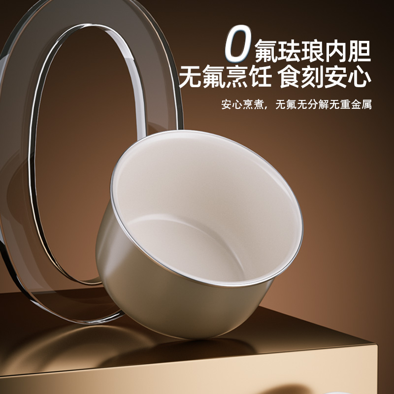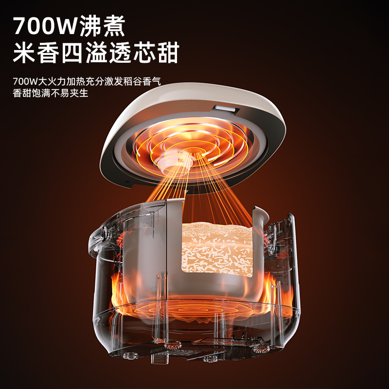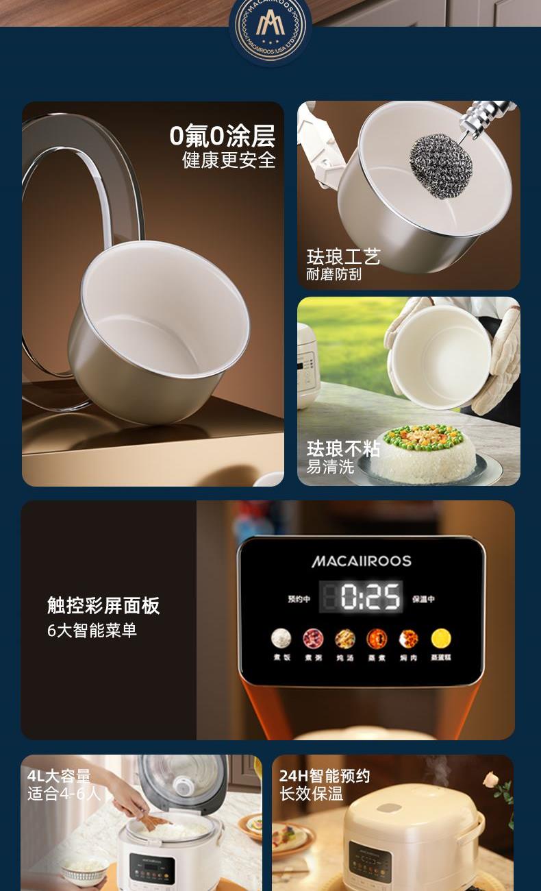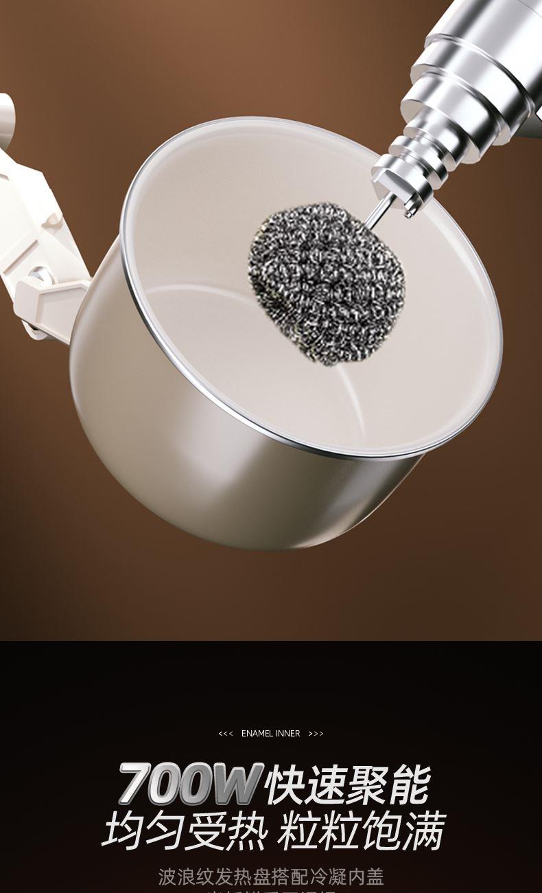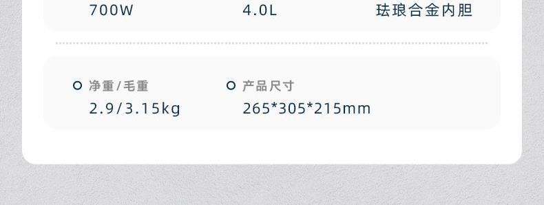 額定功率:700W 額定容量:4.0L 額定電壓:220V~ 額定頻率:50Hz 產(chǎn)品凈重:2.90kg 產(chǎn)品毛重:3.15kg 整箱重量:20.3kg 裝 箱 數(shù):6臺/箱 琺瑯內(nèi)膽0氟0分解加厚琺瑯內(nèi)膽,傳熱均勻,易清潔 智能烹煮6大核心菜單,24h智能預約,長效保溫; 觸控彩屏面板,四位數(shù)碼顯示,智能程序控制; 控溫&便捷提手波浪紋發(fā)熱盤,傳感器控溫;便捷提手易提拿。
